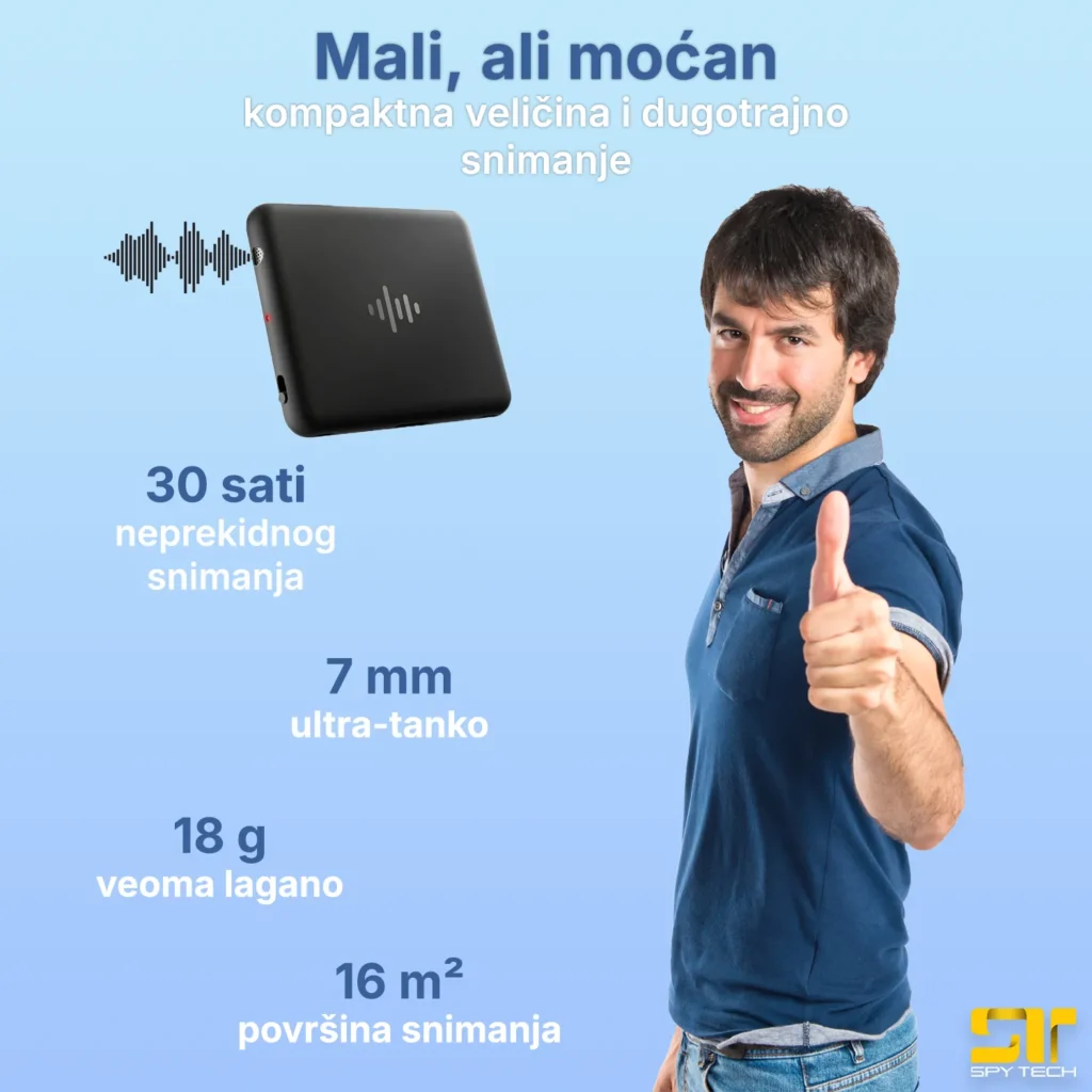 Automatsko snimanje samo kada je potrebno – Zahvaljujući aktivaciji na glas, uređaj beleži samo trenutke kada ima zvuka – razgovora, čime štedi bateriju i 32 GB memorijskog prostora.